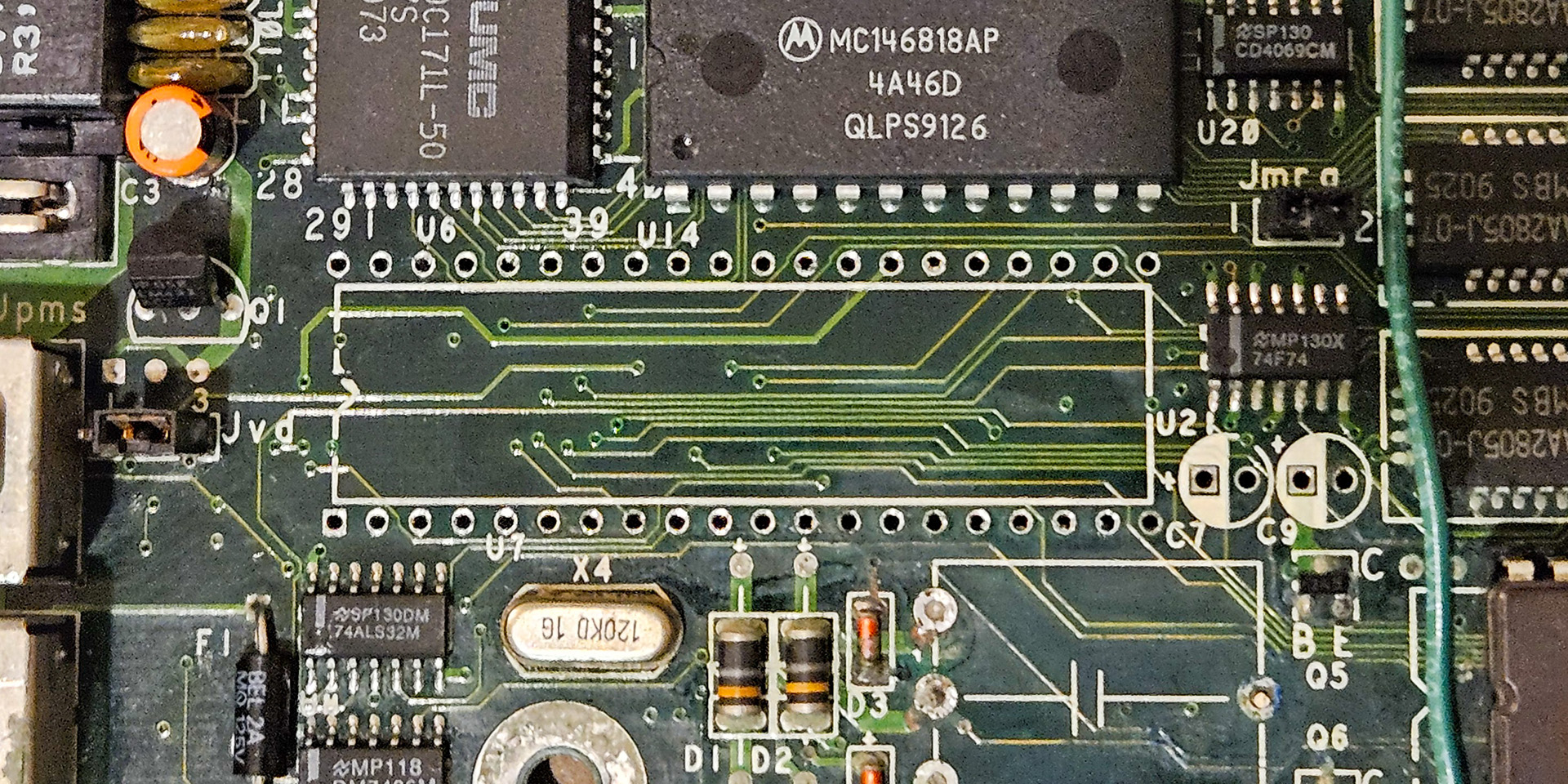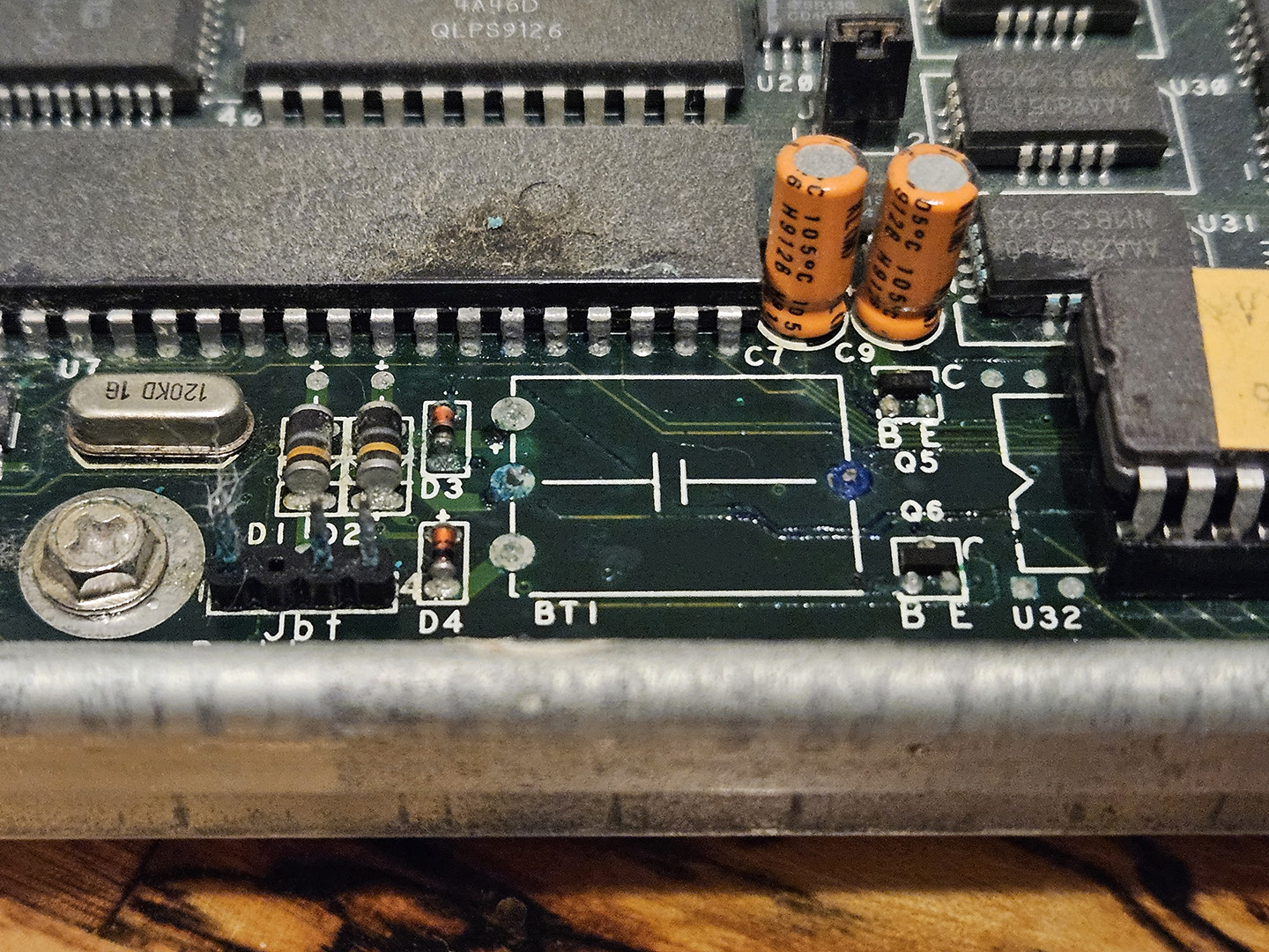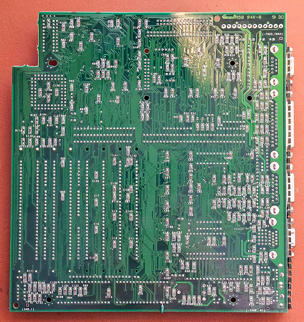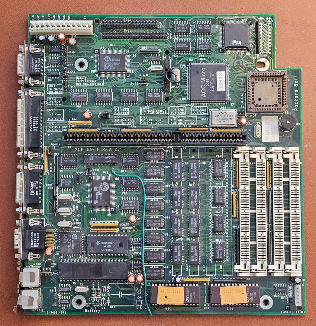 Upon receiving this beast, I excitedly plugged it in, attached a keyboard, connected a VGA monitor, and pushed the power switch. The cooling fan spun and the power LED flashed yellow and then green, but the computer showed no other signs of life. No happy BIOS beeps or display output. Clearly, there was work to be done on this old computer. I then opened the case and inspected the motherboard. Unsurprisingly, the soldered-on BIOS battery leaked corrosive goo into the computer. This is likely the cause of [at least one] issue. After removing the battery and cleaning the area, it became clear that the batterysplosion had damaged the motherboard. First, I decided to use my multimeter to verify that circuit board traces in the area still conducted electricity. I set my multimeter to beep-beep (continuity) mode and started looking. Several of the most damaged traces supplied battery power to the BIOS; I temporarily ignored those. At length, I found a broken trace that went between the high BIOS chip and the PAL16LBACN IC near the ISA slot in the center of the motherboard. I then carefully soldered a wire between those points and attempted to start the computer again. Still, no display and no BIOS beep.