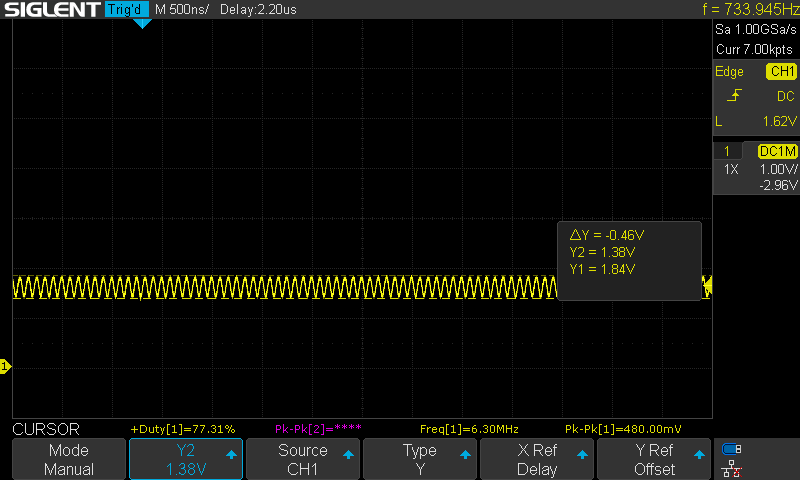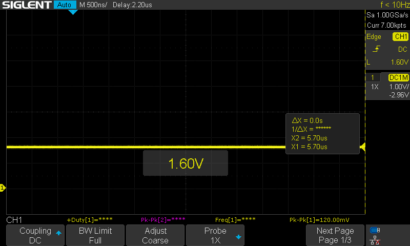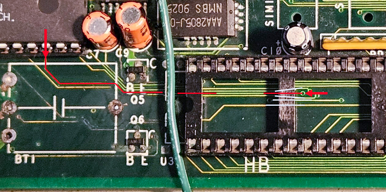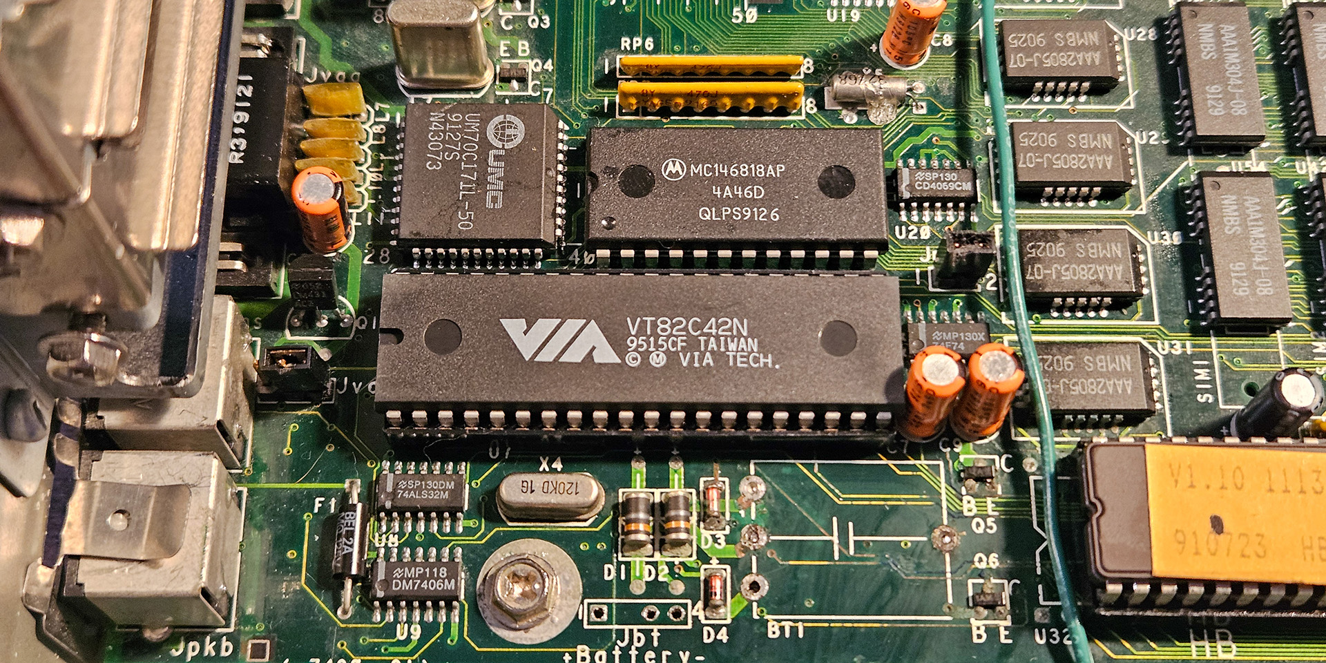 Unfortunately, the POST code remained the same regardless of whether the 8042 was installed, the VT82C42 was installed, or if no chip was installed at all. I knew that this likely meant that some component was bad or that I had missed a broken circuit board trace. I reinstalled the original 8042, set up my oscilloscope, and began probing the IC activity during startup. I scoped each of the 40 pins, one by one, as I applied power to the computer and the system attempted to POST. Almost all of the pins went to logic LOW/HIGH states or flickered with normal digital activity. I noticed, however, that three of the pins were not acting as expected. Two were clock lines, connected to a crystal oscillator. One appeared to float at 900mV (pin 2) and the other (pin 3) seemed to produce a very weak clock signal. Though this clock circuit appeared to be suboptimal, the keyboard controller IC still seemed to be flipping its output pins on and off. This means that the chip was executing code, a task that would be impossible without a clock signal. I then turned my attention to pin 9, which appeared to float at 1.6V. According to the datasheet, pin 9 (A0) is an input signal from the CPU telling the keyboard controller whether an incoming byte is a command or data byte. This pin floating would definitely explain why the CPU is unable to read from or write to the 8042. Clearly, I likely had another bad trace to find. I scoured the board and images that I took with the chip removed and found that there was a trace leaving pin 9 of the 8042 that went underneath the silkscreen IC outline. It then traveled directly below where the battery used to be, and then underneath the high BIOS IC. The trace appeared to end on pin 9 of the high BIOS. I traced its path as well as I could, and then checked continuity between the two ends. The trace resistance was in the megohm range and certainly faulty.
