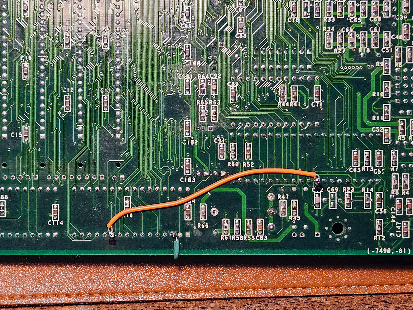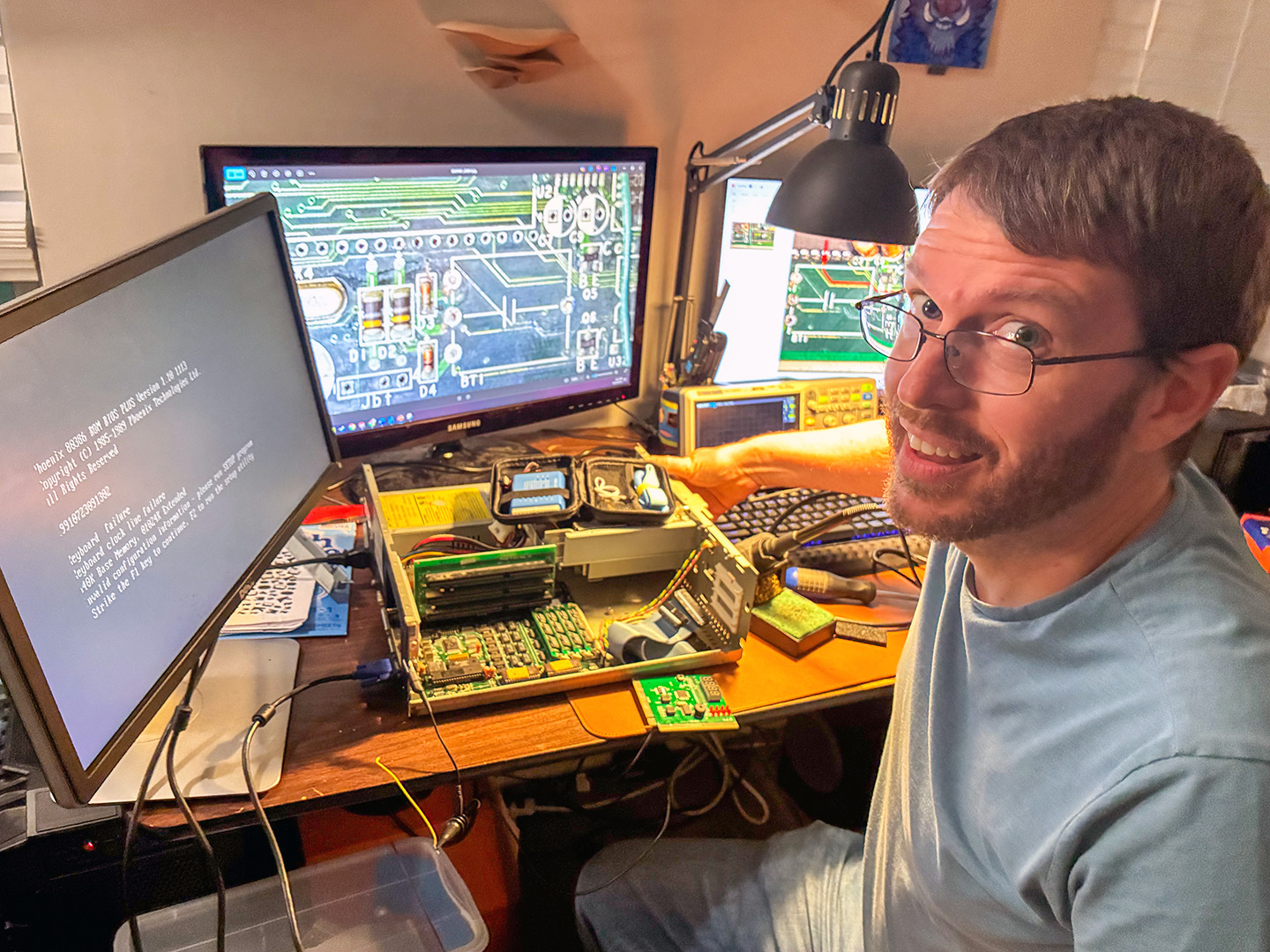 I installed a bodge wire between pin 9 of the 8042 keyboard controller and pin 9 of the high BIOS chip. I started the computer, heard two beeps, and knew that it was POSTing! I connected a monitor and found that it was attempting to boot.