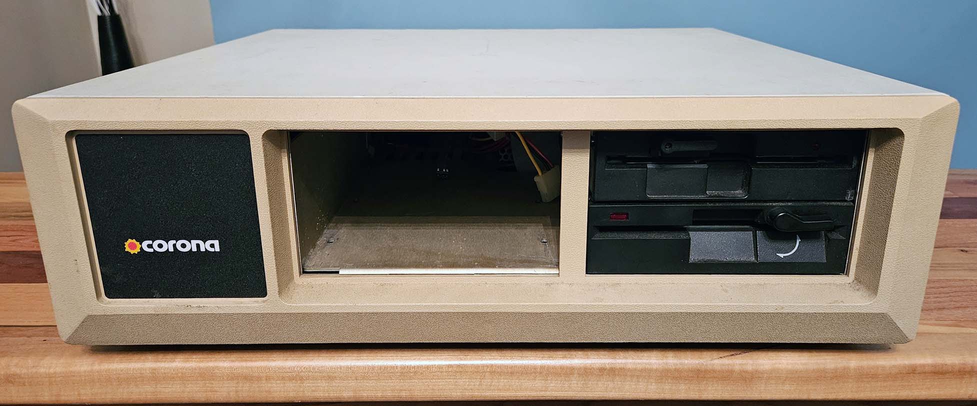 April 28, 2023I recently bought this old Corona Data Systems PC-21 untested in an online auction. I have an affinity for antique PCs but so far have been unable to afford much of a collection. This specimen was relatively inexpensive, though I found out why once it arrived on my doorstep. For starters, it did not come with a keyboard. I didn't bother to look and see if it used a typical XT or AT style connector, a decision that still haunts me at the time of writing. Also, this model shipped with either two full height 5.25" floppy drives or one full height floppy and one full height hard drive. I bought this one with two half-height 5.25" floppy drives that were clearly not intended for this computer.