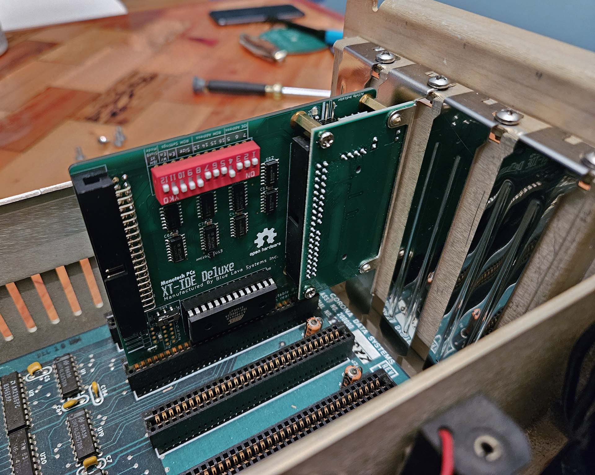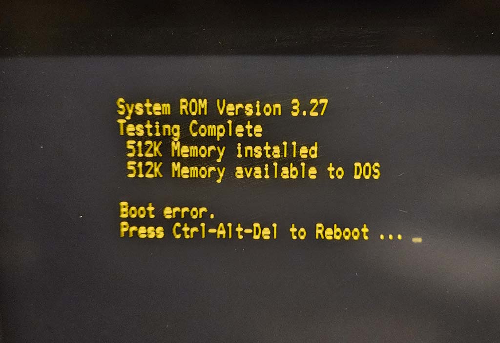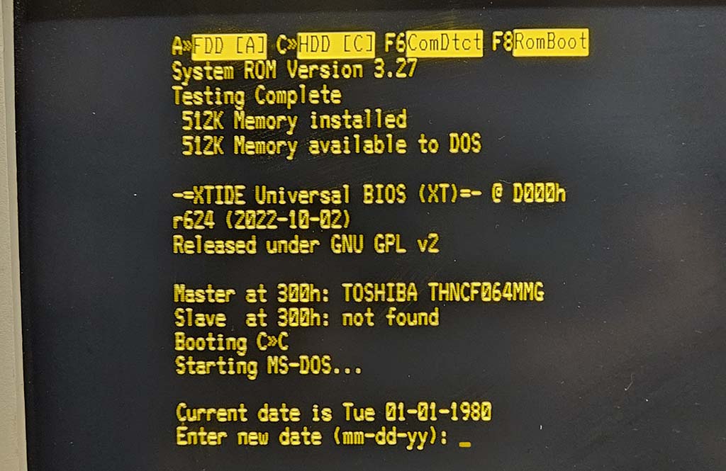 I tried connecting the monitor to that weird EGA card but did not immediately get an output. I then plugged the monitor directly to the motherboard video output and viola! I got an image! It was just the letter "K," but still. An image! That was the happiest I have ever been to recieve the infamous one letter 'k.' reply. I had a hunch that this error message stood for "keyboard," but it took a fair bit of sleuthing (googling) to confirm. I temporarily wired a PS/2 keyboard to the PC-21 input, and the computer recognized it immediately. Whenever I tried to press a key, however, the computer only made angry-sounding beeps and refused to do anything else. I tried to boot from a floppy disk, but found that one or both of my drives were malfunctioning. I pulled the EGA card from the system and installed one of Monotech PC's XT-IDE Deluxe compact flash adapter cards along with an MS-DOS 6-loaded CF. The PC-20 booted directly into DOS!