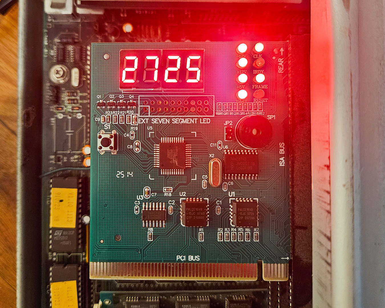 Upon receiving this beast, I excitedly plugged it in, attached a keyboard, connected a VGA monitor, and pushed the power switch. The cooling fan spun and the power LED flashed yellow and then green, but the computer showed no other signs of life. No happy BIOS beeps or display output. Clearly, there was work to be done on this old computer. I then opened the case and inspected the motherboard. Unsurprisingly, the soldered-on BIOS battery leaked corrosive goo into the computer. This is likely the cause of [at least one] issue. After removing the battery and cleaning the area, it became clear that the batterysplosion had damaged the motherboard. First, I decided to use my multimeter to verify that circuit board traces in the area still conducted electricity. I set my multimeter to beep-beep (continuity) mode and started looking. Several of the most damaged traces supplied battery power to the BIOS; I temporarily ignored those. At length, I found a broken trace that went between the high BIOS chip and the PAL16LBACN IC near the ISA slot in the center of the motherboard. I then carefully soldered a wire between those points and attempted to start the computer again. Still, no display and no BIOS beep.