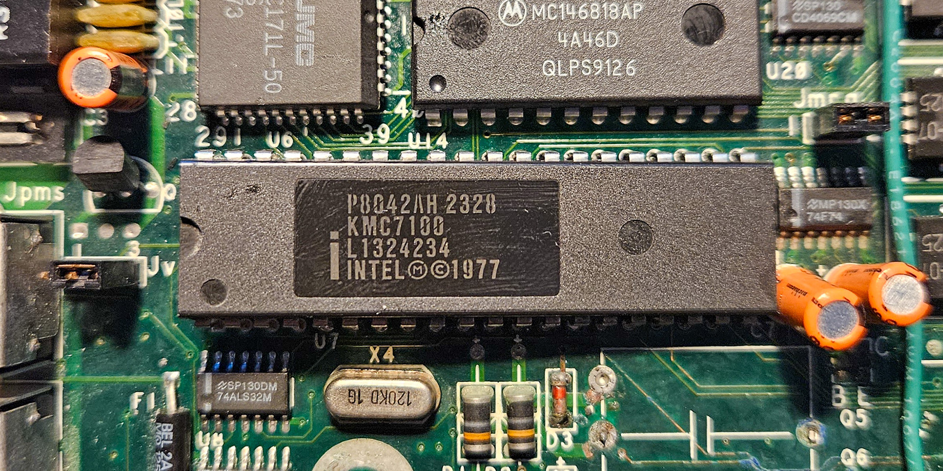 I installed a bodge wire between pin 9 of the 8042 keyboard controller and pin 9 of the high BIOS chip. I started the computer, heard two beeps, and knew that it was POSTing! I connected a monitor and found that it was attempting to boot.