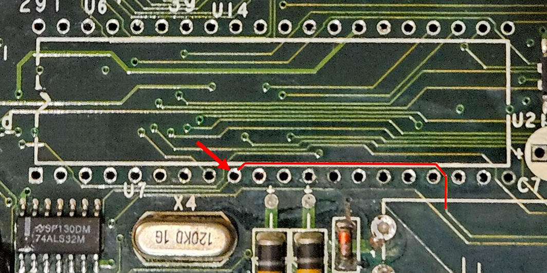 Unfortunately, the POST code remained the same regardless of whether the 8042 was installed, the VT82C42 was installed, or if no chip was installed at all. I knew that this likely meant that some component was bad or that I had missed a broken circuit board trace. I reinstalled the original 8042, set up my oscilloscope, and began probing the IC activity during startup. I scoped each of the 40 pins, one by one, as I applied power to the computer and the system attempted to POST. Almost all of the pins went to logic LOW/HIGH states or flickered with normal digital activity. I noticed, however, that three of the pins were not acting as expected. Two were clock lines, connected to a crystal oscillator. One appeared to float at 900mV (pin 2) and the other (pin 3) seemed to produce a very weak clock signal. Though this clock circuit appeared to be suboptimal, the keyboard controller IC still seemed to be flipping its output pins on and off. This means that the chip was executing code, a task that would be impossible without a clock signal. I then turned my attention to pin 9, which appeared to float at 1.6V. According to the datasheet, pin 9 (A0) is an input signal from the CPU telling the keyboard controller whether an incoming byte is a command or data byte. This pin floating would definitely explain why the CPU is unable to read from or write to the 8042. Clearly, I likely had another bad trace to find. I scoured the board and images that I took with the chip removed and found that there was a trace leaving pin 9 of the 8042 that went underneath the silkscreen IC outline. It then traveled directly below where the battery used to be, and then underneath the high BIOS IC. The trace appeared to end on pin 9 of the high BIOS. I traced its path as well as I could, and then checked continuity between the two ends. The trace resistance was in the megohm range and certainly faulty.